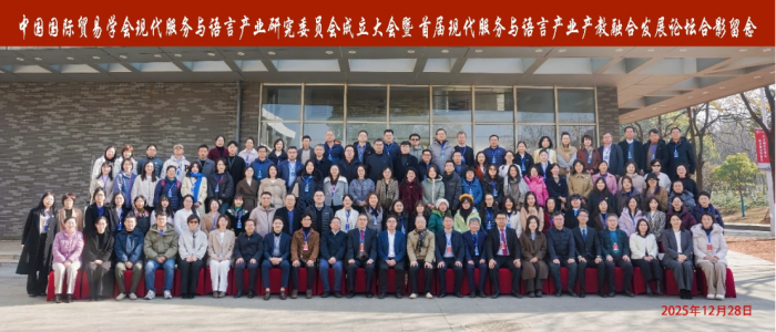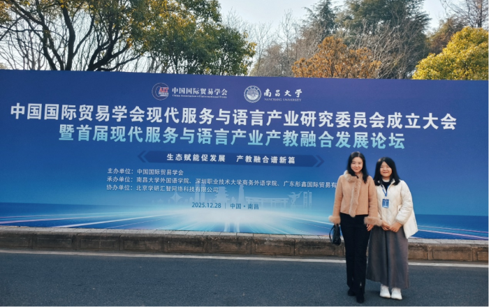 2025年12月28日,中国国际贸易学会现代服务与语言产业研究委员会成立大会暨首届现代服务与语言产业产教融合发展论坛在南昌大学隆重举行,本次论坛由中国国际贸易学会主办,南昌大学外国语学院承办。外国语学院副院长吕晓敏作为中国国际贸易学会现代服务与语言产业研究委员会常务理事受邀参加此次会议,外语系主任胡楠随行参会。