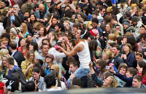 Example of a well known flash mob was the April 2006 silent disco in London. At various London Underground stations, people gathered with their portable music devices, and at a set time began dancing to their music. It was reported that more than 4,000 people participated at London Victoria station.
