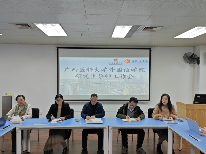 2026年1月13日上午,广西医科大学外国语学院研究生导师工作会在综合楼304会议室召开,重点围绕2023级翻译硕士研究生毕业论文答辩及2024级翻译硕士毕业实习等关键培养环节进行了工作部署。学院领导班子成员、全体硕士生导师、教研科及MTI教育中心工作人员参会,会议由副院长吕晓敏主持。